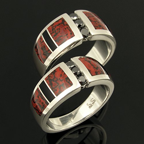 Three pieces of gray dinosaur bone are inlaid in each side. Whether it's a dinosaur bone ring or a turquoise wedding ring set, you will find our jewelry designs stand out in a crowd. Unique dinosaur bone rings and jewelry, turquoise engagement rings and australian opal jewelry handmade in sterling silver and gold by hileman silver jewelry. Meteorite band with black diamond stone.